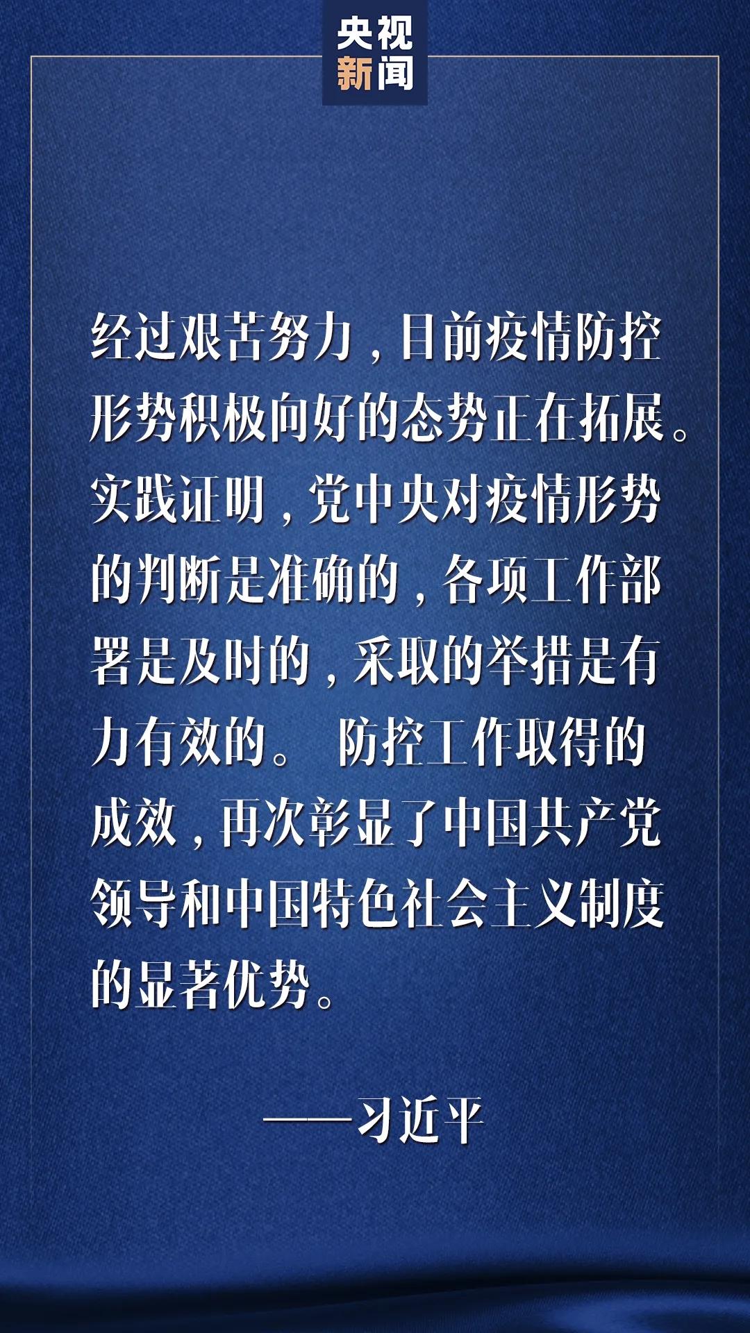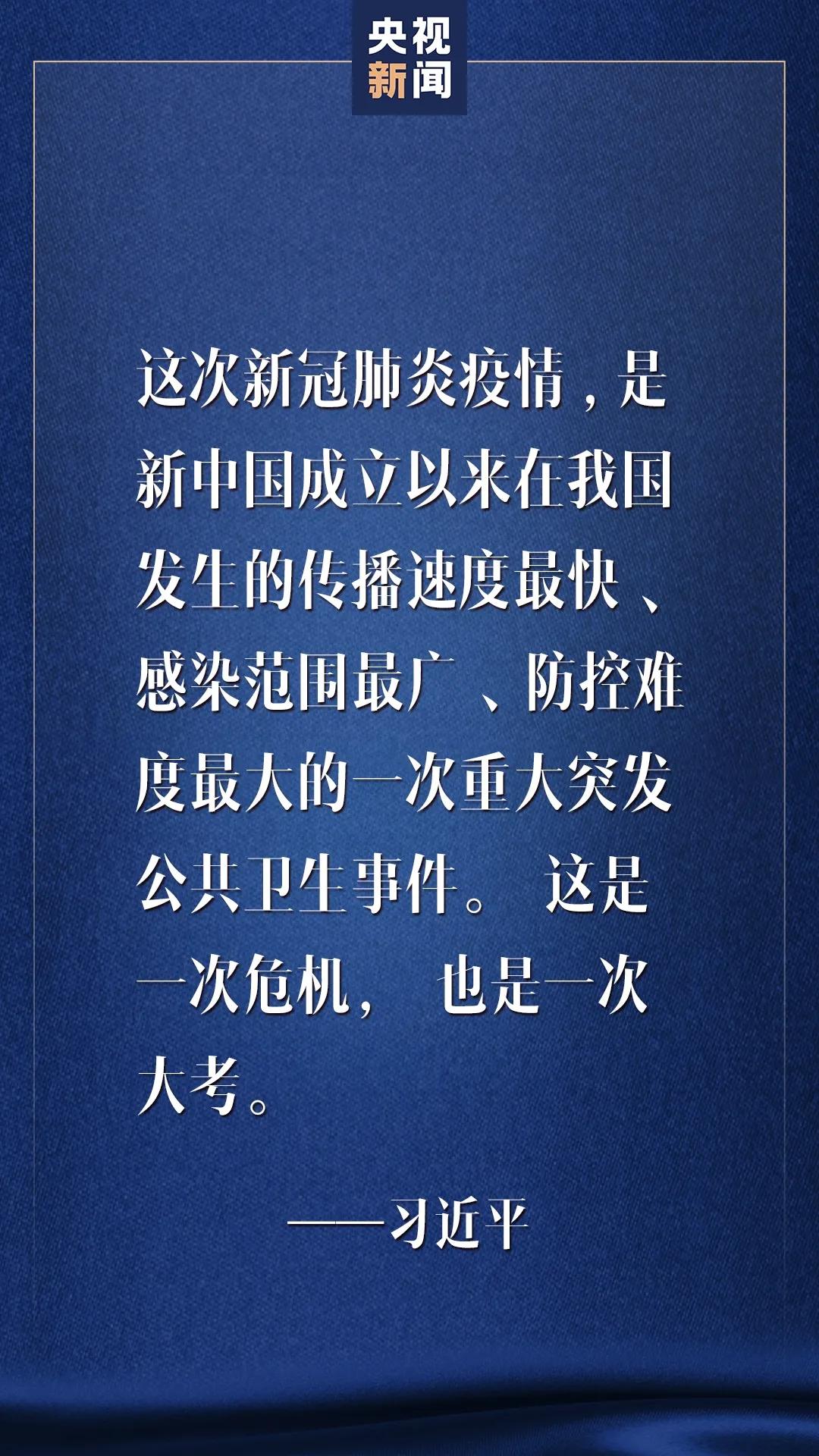 习近平强调,这次新冠肺炎疫情,是新中国成立以来在我国发生的传播速度最快、感染范围最广、防控难度最大的一次重大突发公共卫生事件。对我们来说,这是一次危机,也是一次大考。经过艰苦努力,目前疫情防控形势积极向好的态势正在拓展。实践证明,党中央对疫情形势的判断是准确的,各项工作部署是及时的,采取的举措是有力有效的。防控工作取得的成效,再次彰显了中国共产党领导和中国特色社会主义制度的显著优势。