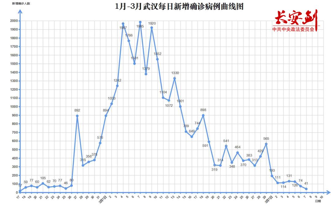 为研判武汉疫情发展态势,陈一新分析了2月1日以来每日新增确诊病例的走势:2月2日至14日,历时13天,每天新增确诊病例在1000人以上—2000人以下的4位数区间波动,可视为高位运行期;2月15日至3月5日,历时20天,每天新增确诊病例在1000人以下—100人以上的3位数区间波动下行,可视为中位运行期;3月6日和7日每天新增确诊病例进入100人以下—10人以上的2位数区间,可视为低位运行期,最后将会进入个位数的尾期。
