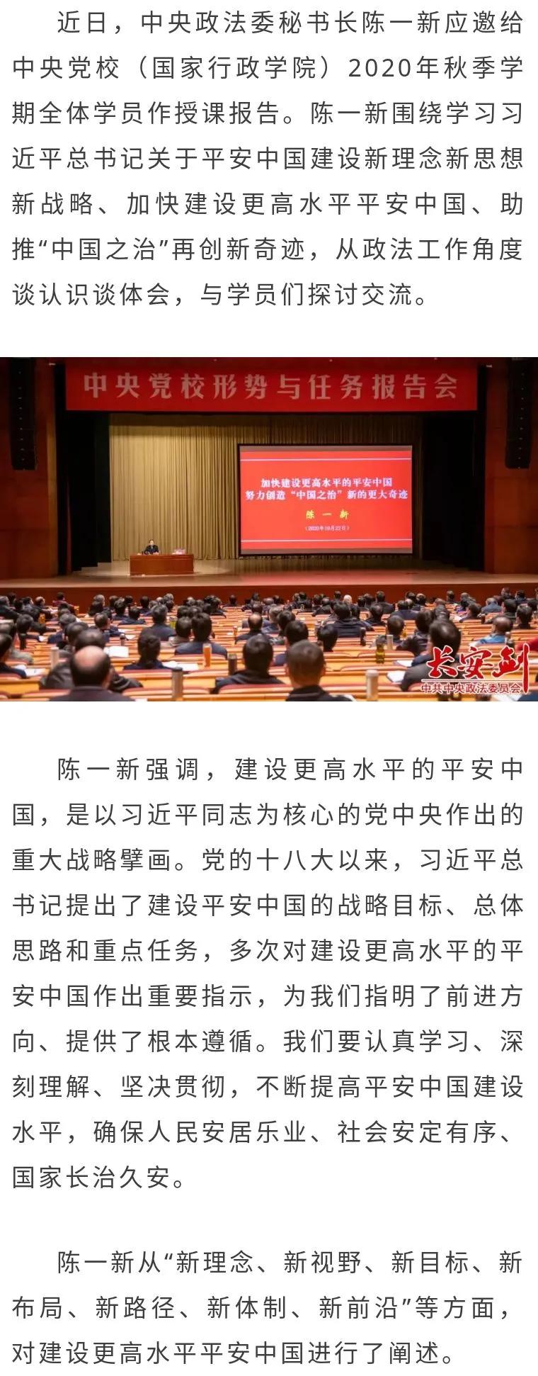陈一新应邀给中央党校全体学员作授课报告: 加快建设更高水平的平安中国 助推“中国之治”再创新奇迹