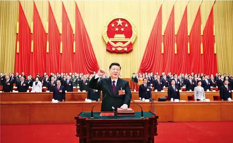2018年3月17日,十三届全国人大一次会议在北京人民大会堂举行第五次全体会议。习近平当选中华人民共和国主席、中华人民共和国中央军事委员会主席。这是习近平进行宪法宣誓。新华社记者 鞠鹏/摄