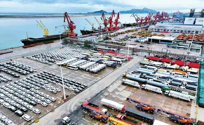 江苏全面把握在全国开放格局中的发展定位,发挥“一带一路”交汇点优势,聚焦建设具有世界聚合力的双向开放枢纽的目标,加快推进高水平对外开放,外贸进出口总额连续多年居全国前列。图为2024年10月18日,在江苏省连云港东方港务分公司码头,大批国产车辆集港准备装船(无人机照片)。新华社发 王春/摄
