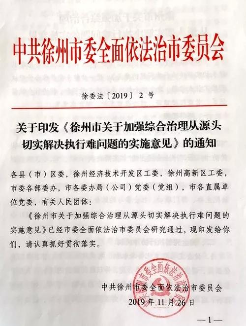 11月26日,徐州市委全面依法治市委员会在全省率先推出《徐州市关于加强综合治理从源头切实解决执行难问题的实施意见》,对加强执行难综合治理、深化执行联动机制建设、加强人民法院执行工作作出全面部署。这是中央全面依法治国委员会《关于加强综合治理从源头切实解决执行难问题的意见》印发后,为进一步健全完善全市综合治理执行难工作大格局,建立健全解决执行难长效机制,徐州中院根据最高法院和省法院工作安排,市委政法委牵头、市中院承担主体责任、所涉职能部门作为成员单位共同推动破解执行难题的重要成果,对于落实全面依法治国方略、优化法治营商环境、促进社会信用体系建设必将起到重要的促进作用。