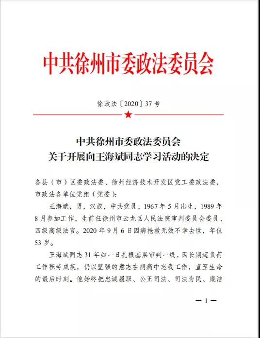 9月22日,市委政法委印发《关于开展向王海斌同志学习活动的决定》。