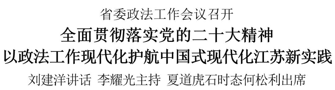 2月1日,省委政法工作会议在南京召开。会议坚持以习近平新时代中国特色社会主义思想为指导,深入学习贯彻党的二十大精神,认真贯彻落实中央政法工作会议部署和省委工作要求,总结工作,分析形势,研究部署2023年和今后一个时期全省政法工作。省委常委、政法委书记刘建洋出席会议并讲话,副省长、省公安厅厅长李耀光主持会议,省法院院长夏道虎、省检察院检察长石时态、武警江苏省总队司令员何松利出席会议。