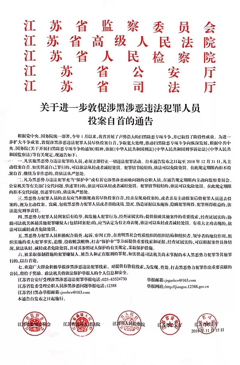 编者按:为进一步扩大扫黑除恶专项斗争成果,形成强大声势,营造浓厚氛围,推动专项斗争向纵深发展,夺取全面胜利,近日,江苏省监察委员会会同江苏省高级人民法院、江苏省人民检察院、江苏省公安厅、江苏省司法厅等部门联合发布了《关于进一步敦促涉黑涉恶违法犯罪人员投案自首的通告》,敦促涉黑涉恶违法犯罪人员尽快投案自首,争取宽大处理。现将《通告》全文刊登如下。