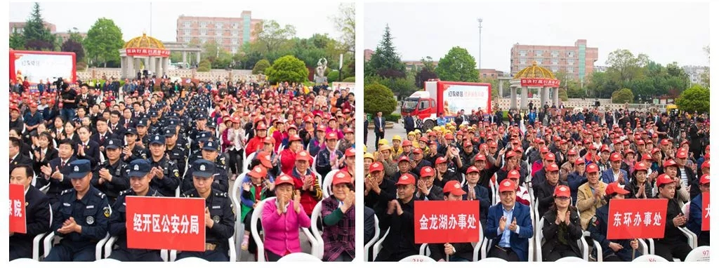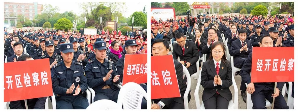 经开区法院、检察院、公安分局的主要领导以及纪工委、组织人事部、宣传部等扫黑除恶专项斗争领导小组成员单位分管领导、联络员,各镇(街)分管领导、政法办全体人员,各村(居)书记、主任,辖区平安志愿者、群众代表、企业代表等近千人参加活动。经开区党工委委员、政法委书记、经开区公安分局党委书记张军参加活动并讲话,同时宣布经开区新一轮扫黑除恶专项斗争集中宣传活动启动。