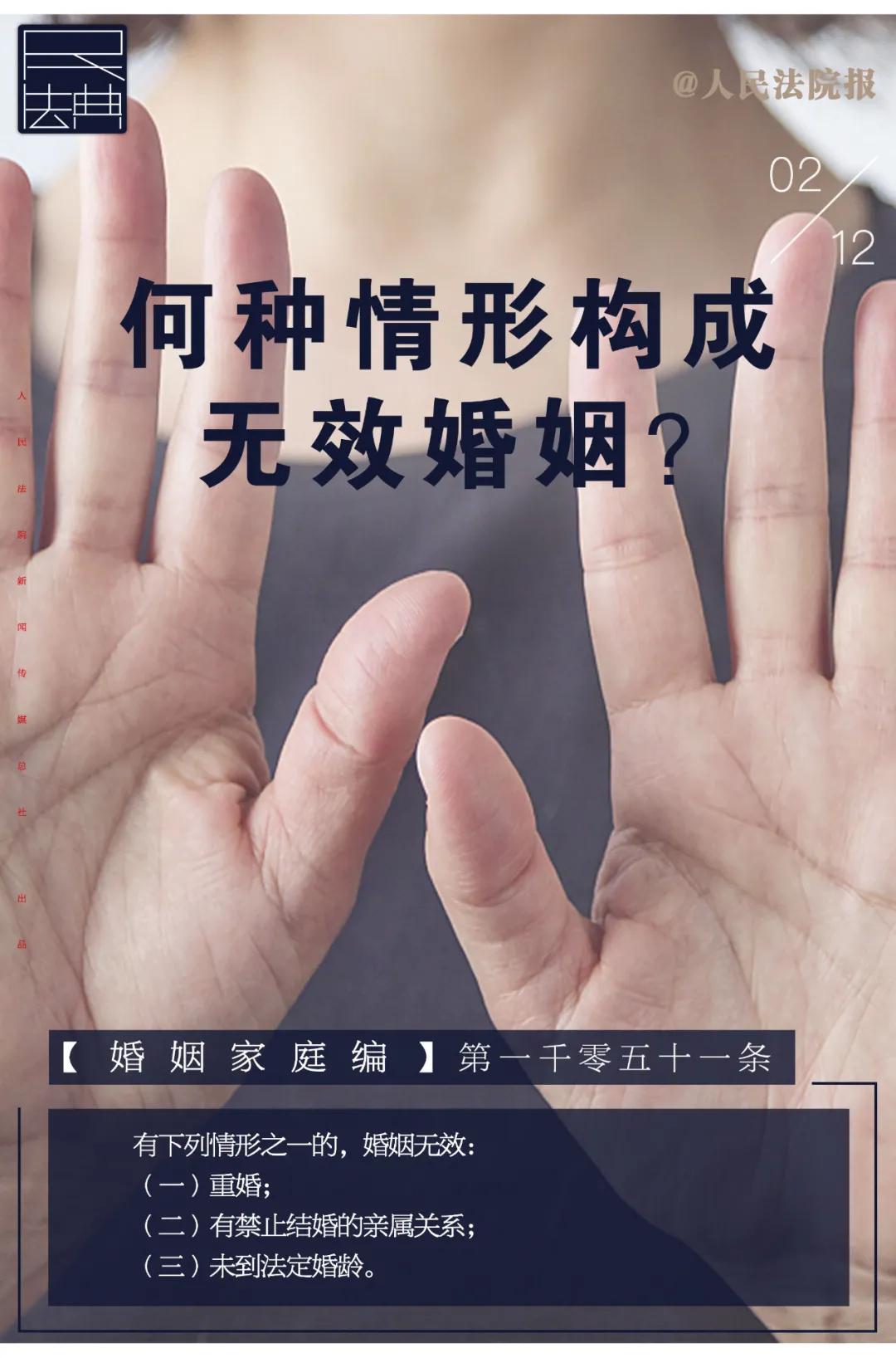 第一千零五十一条 有下列情形之一的,婚姻无效:(一)重婚;(二)有禁止结婚的亲属关系;(三)未到法定婚龄。