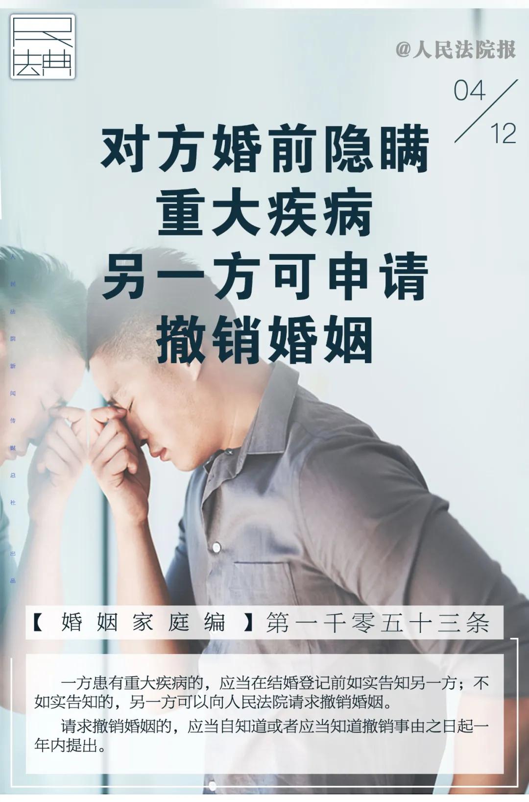 第一千零五十三条 一方患有重大疾病的,应当在结婚登记前如实告知另一方;不如实告知的,另一方可以向人民法院请求撤销婚姻。