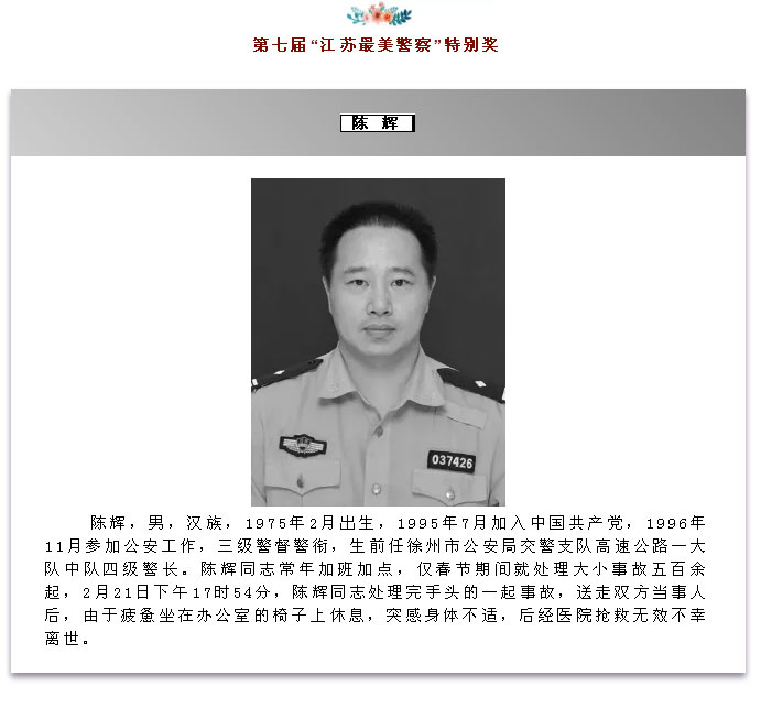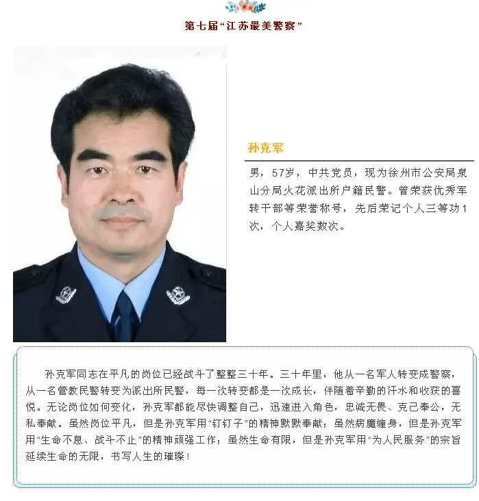 徐州市公安局泉山分局火花派出所民警孙克军获得“江苏最美警察”荣誉称号,睢宁县公安局副局长张琳获提名奖,交警支队高速公路一大队因公牺牲民警陈辉获特别奖 。