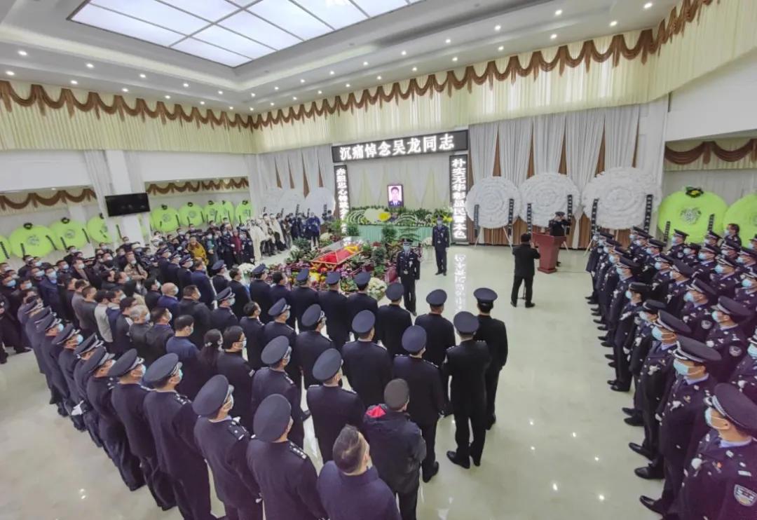 阴云密布,草木含悲。11月17日上午9时,江苏省邳州市公安局运西派出所副所长、三级警长吴龙遗体告别仪式在邳州市殡仪馆举行,各级领导、民警代表、亲属好友及自发群众约1100余人赶来送行。