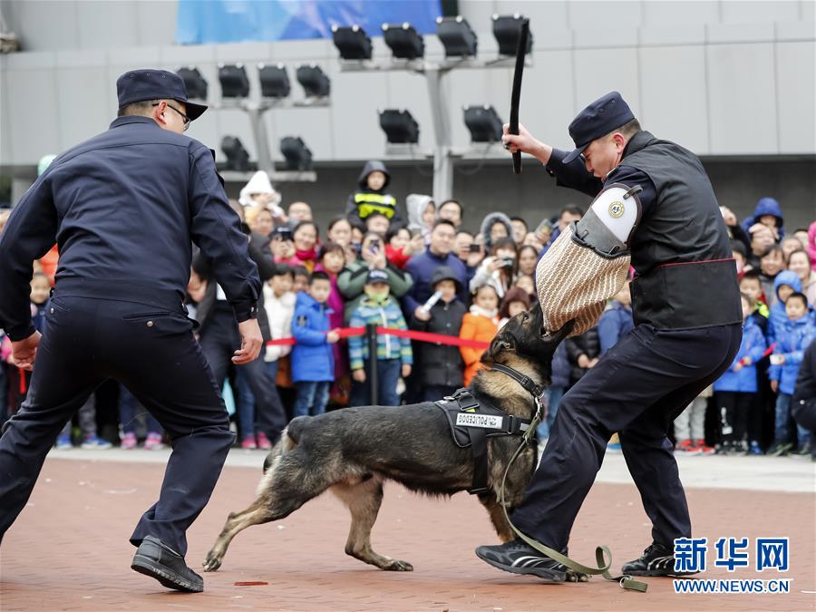 12月8日,公安干警在活动现场与警犬共同展示缉捕“罪犯”。当日,以“警徽闪耀·平安共享”为主题的江苏省无锡市公安局警营开放日活动在该市体育中心举行,共有20个警种参与。活动设有126个互动展示项目,内容涵盖打击犯罪、便民服务、交通安全等警务工作。活动旨在通过创新科技应用展示、警务技能现场演练、安全防范知识宣传等形式,号召更多的群众关心社会治安,参与平安共建。