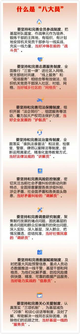 近日,江苏省委政法委下发《关于建立健全全省政法系统机关党员干部“下沉一线”长效机制的意见》,明确提出完善“八项制度”,当好“八大员”,为全面夺取疫情防控和经济社会发展“双胜利”作出新的更大贡献。那么,什么是“八大员”,小编带大家一起了解一下:
