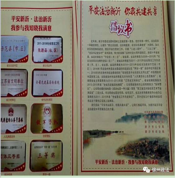 印制“平安法治新沂你我共建共享”、“平安法治新沂倡议书”等宣传袋、宣传彩页、折页、宣传品,印制10万份“致全市学校师生一封平安信”。“法治书记”进校园宣讲法治教育课。通过一系列活动,进一步提高了新沂市广大居民的平安建设和法治意识,营造了人人向往平安、人人关心平安、人人建设平安的浓厚氛围。