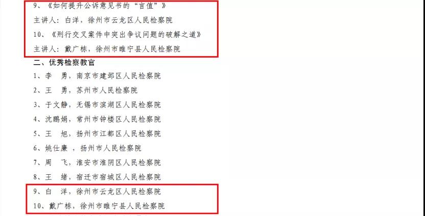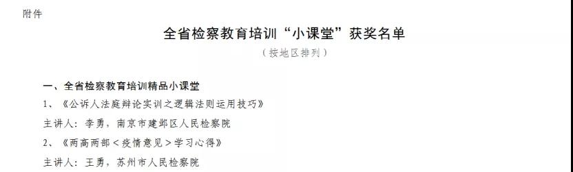 日前,江苏省检察院举办的全省检察机关教育培训“小课堂”评选结果揭晓,在上报的43门小课堂课程和32门微课中,经过资格审查、条线初评、专家综合评审三轮评选,最终产生“精品小课堂”10门、“优秀检察教官”10名、“精品检察微课”10门。其中,徐州市检察机关再获佳绩,4门小课堂分别获评“精品小课堂”、“精品检察微课”,2名检察干警获评“优秀检察教官”称号!